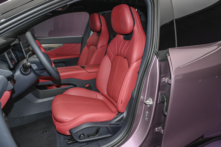 坐进领克07 EM-P的车内,那种轻奢感立马就扑面而来。暗影红和日光米两种新内饰配色,加上Nappa真皮蒙皮,手感细腻得很。缝线工艺据说用的是奢侈品常用的绗缝技术,30mm七针的间距,跟刺绣似的,细节控会喜欢。中控台好多地方用了电镀饰条和金属拉丝面板,氛围灯这么一开,晚上开车那浪漫感直接拉满。